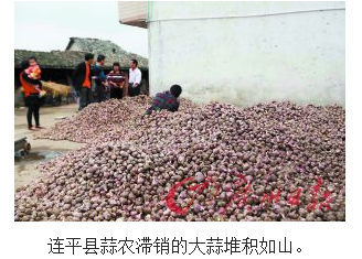 据连平县农业局有关负责人介绍,今年入春以来,该县忠信、大湖、绣缎、三角等镇种植的大蒜又迎来了丰产时节,全县现有大蒜种植面积大概有8000亩,平均亩产可收获3000多斤鲜嫩大蒜(当地村民又称湿蒜),部分良田亩产湿蒜高达5000斤左右,眼下,连平县忠信地区(忠信、大湖、三角、油溪、绣缎、高莞)六个乡镇仍有上百吨湿蒜或火蒜滞销。这位负责人称,由于当地湿蒜或火蒜是由市场定价,蒜农没有定价权,且政府部门对外宣传和推广力度不足,造成当地大蒜对外认知度低和销售渠道狭窄。
